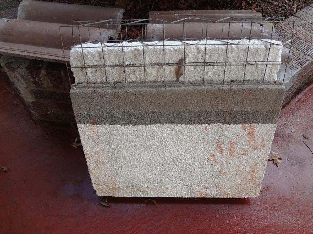 In the photo is a 24” x 24” panel wall system that consists of 1/8” steel studs with 2” of foam between each stud. One coat of plaster was applied to a thickness approximately one inch that imbeds the steel studs that has a scratch coat finish. Twenty-four hours after the first scratch coat a one inch sand float finish was applied.