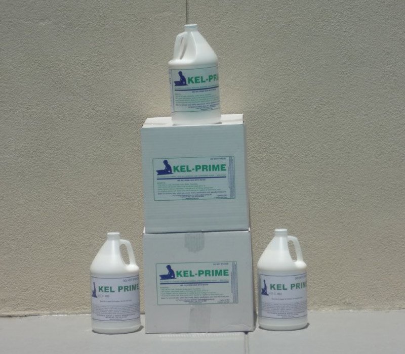 Kel-Prime is a non-toxic SEALING, BONDING, CURING and HARDENING agent. As a SEALANT it provides water retention for proper CURING/HYDRATION. As a BONDING agent it provides excellent bonding for plaster over CMU units, and greatly reduces rebound. As a CURING agent it “will cure the plaster in 24 hours”. It helps the curing process in shotcrete, concrete, etcetera CMU units. Kel-Prime will HARDEN a soft plaster wall in 24 hours. Kel-Prime meets EPA LEEDS and CARBON FOOTPRINTING standards, and is NON-TOXIC and made in the USA. It is packaged in four-gallon cases, or in 55-gallon drums.